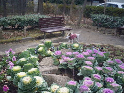 おだやかな公園で、おだやかな葉牡丹と、おだやかな犬です。