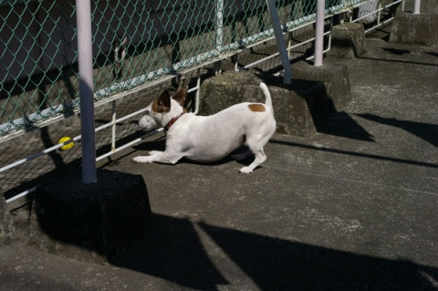 ボールが柵の向こうにいっちゃうと、犬には、どうしても取れないので、ひたすらじっと見つめています。