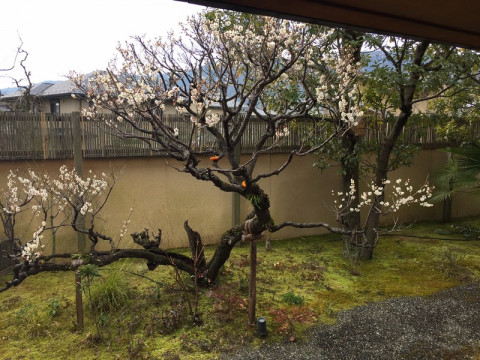 梅の枝に半分にしたみかんを刺して、鶯色の小鳥がくるのを待つように、明るい春を待つこころを、表しているんですよ。