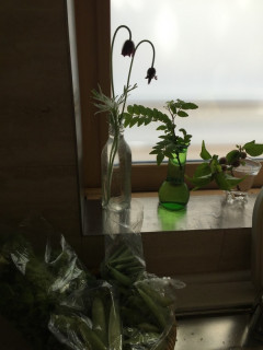 小さな庭の小さな梅やら、山椒やら、えーっとなんだっけやら、無人販売所の100円のえんどう豆、自転車のおじさんにもらったスナップえんどう。