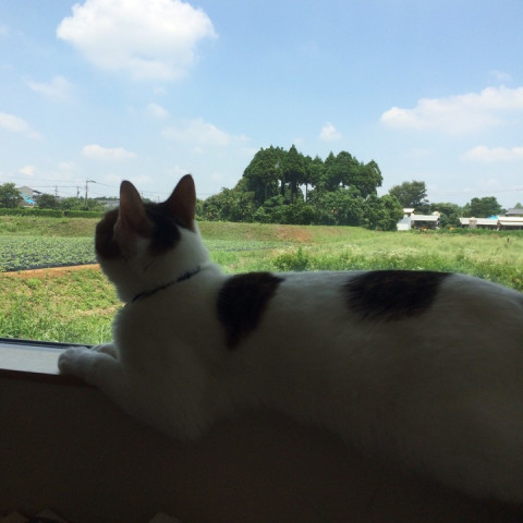 ゴミ箱出身ということですが、いまは、こんなふうに特等席で田園風景を楽しんでます。