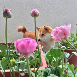 桜みたいに高いところに咲く花は、いっしょに写るのがむつかしいですが、ラナンキュラスは、犬にちょうどいい高さ。