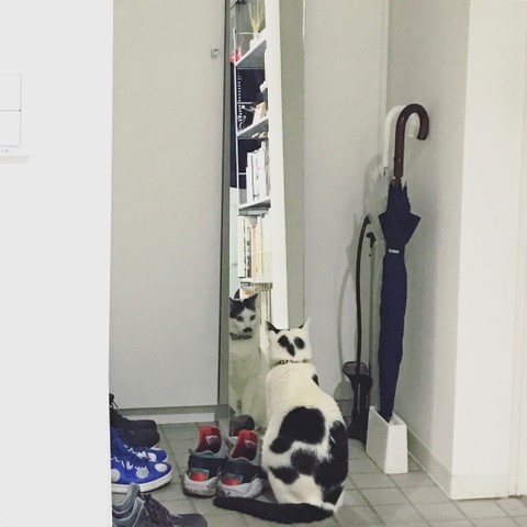 玄関の鏡に、じぶんを映し、身だしなみチェックする。