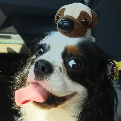 「寅次郎」さんの人形を頭に乗せて、ダブルカップのアイスクリーム状態。
