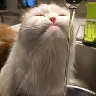 入れ歯を外したおばあさんの顔まねをして蛇口から水を飲んでおります。