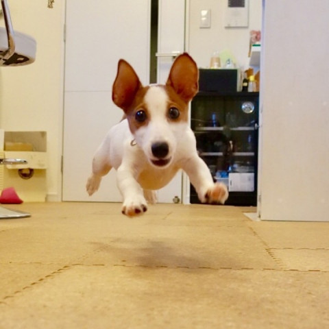 びゅーんと空中を滑っている飛行犬は、まだ5か月の新人さん。