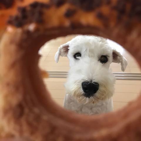 丸い窓から、犬を眺る。