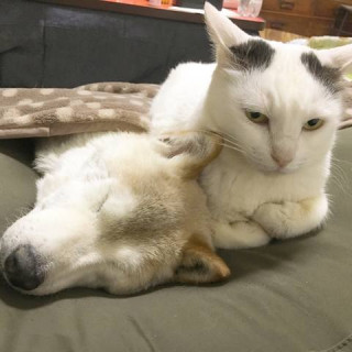 くぅ( 猫・6歳 )ちゃんは、しの( 犬・17歳 )のネンネのジャマしちゃダメって怒られたんだって。