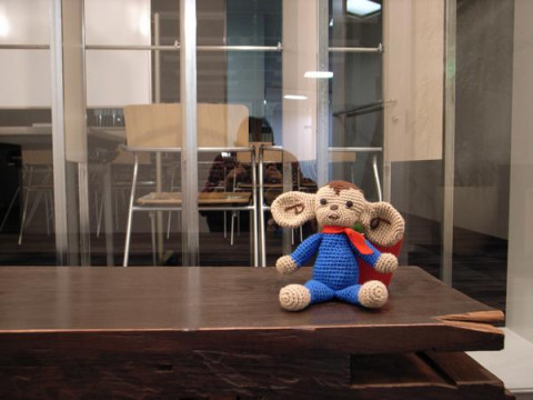 ミーティングルームの前に、長い古材を使ったベンチがあって、そこに、いつのまにか、数年前にカミさんがつくったおサルが置いてありました。