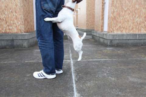 飛びつかれているのが、おとうさん、飛びついているは、犬です。