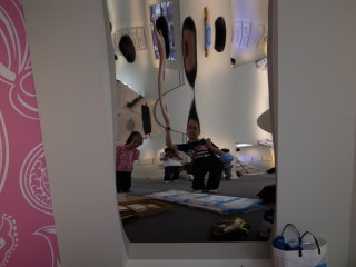 ぐにゃ〜んとする鏡に写ったり、いろんな展示の準備を見たり、ロールケーキを買ったりしてます。