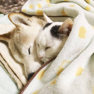 保護された猫のくぅちゃんと、同じく保護犬しのさん。