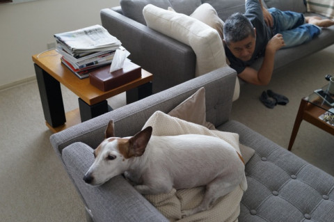 たまにくっつかないでいると、おとうさんが、犬を誘います。