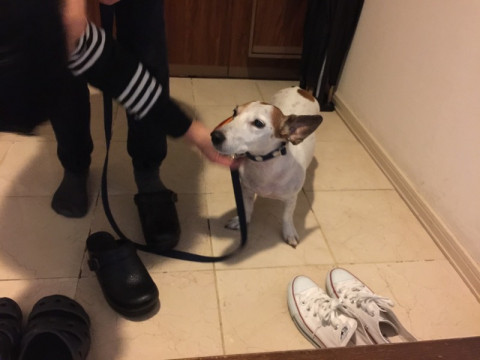 散歩してきたら、首輪を外してもらって、だっこされてお風呂場に行く。