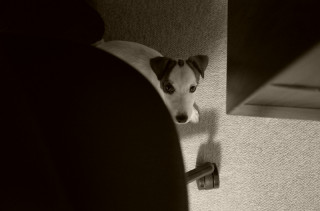 仕事しているおとうさんの足元で、じっとようすをうかがっています。