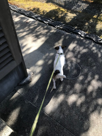 ブイコは京都の家の庭でも、基本的に首輪とリードをしています。