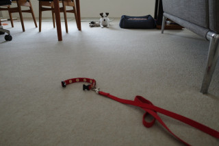 散歩に行こうとさいそくするから、さぁと、リードをつけようとすると、逃げ回ってつけさせてくれない。