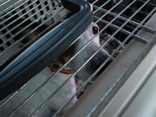 ケージに入れられて移動する場合、自動的に「神妙」な態度になります。