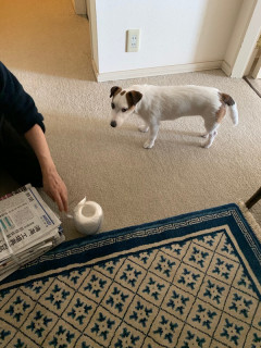 おかあさんが新聞紙をまとめて、捨てようとしています。
