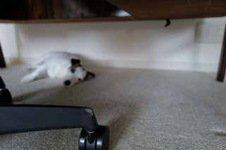 おとうさんの仕事机の下は、朝の定位置として大事にしてます。