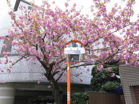 カーブミラーの中でカメラを構えてます。