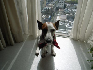散歩に連れていってもらう前の、期待に満ちた時間は、朝日を浴びて待つのです。