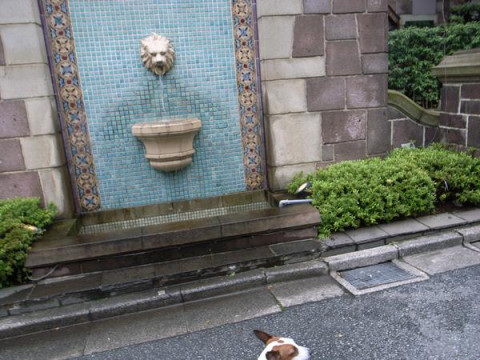 「吐く獅子」を無視する犬。