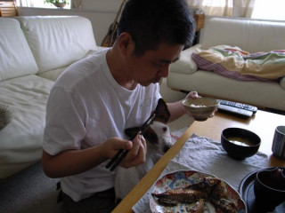 微量のおこぼれを期待して、犬がひざのうえに居座ることがあります。