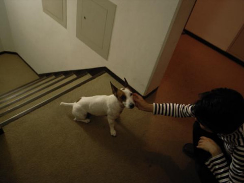 エレベーターの前で、