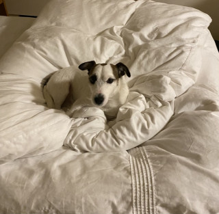 遠目には雪国の犬のようですが、人の寝床で寝る犬です。