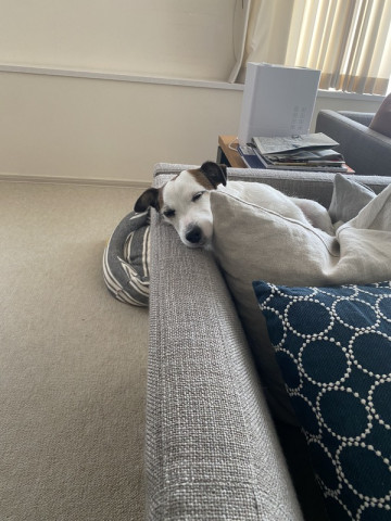 たぶん、世界中で、白くて耳の色の濃い犬は