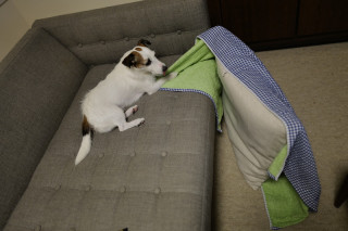 ベッドメイキングは、犬と人とで協力してやります。