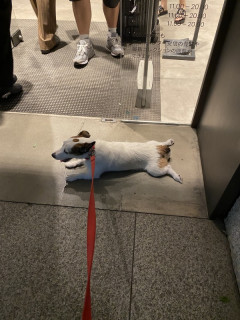 短い散歩の後半では、冷房のあるお店の前で、まるで看板犬のようなふりをして、床にお腹をつけ冷気に当たります。