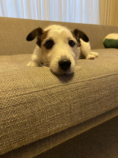 ジャックラッセルテリアって、ほんとにおなか全体を、ぺちゃーって床に着けますよね。