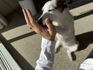 ひなたぼっこしながら、おとうさんの手をなめる。