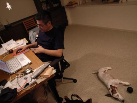 めずらしく、仕事をしてるバカおやじと、だれる犬。