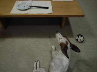 人間のごはんのときに、犬のごはんか、犬のおやつをもらえるようなシステムがあるので、犬も、人間のごはんを待つのです。