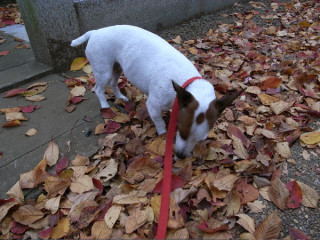 犬は、赤い葉っぱを踏みながら歩くのが好きです。