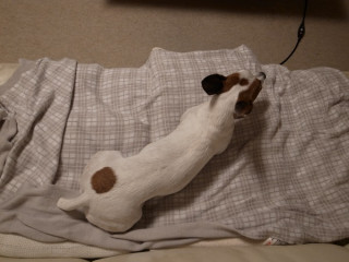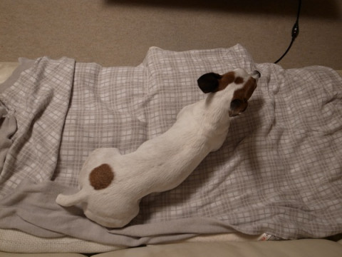 現実の犬は、大雨のなかで、ちょっとだけボール投げをしてもらい足を洗ってもらって、あったまってる…というだけ、です。