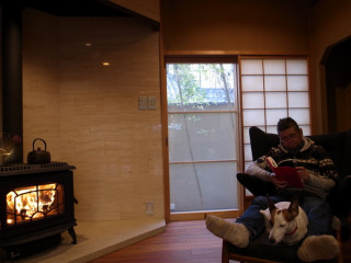 犬がおとうさんにくっつくと、おとうさんにも暖かいし、犬にも暖かいので、いいことです。