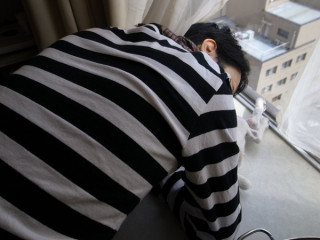 犬が外を見ながらあったまっていたら、人間のおかあさんがやってきて、お腹に耳をあてて、なにか聴いてます。
