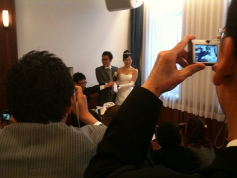 たくさんの人が、ケーキを見にきています。