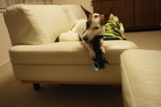 ロープでつくられたねこのかたちのおもちゃを、かわいがっています。