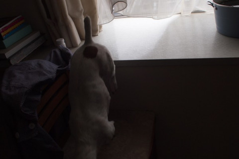 いくら散歩の準備をしはじめても、おとなになった犬は、どたばた身動きなんてしません。