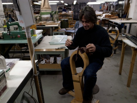 この写真のなかで、アンリさんがつくっているのは、おとうさんが使っている手帳カバー。
