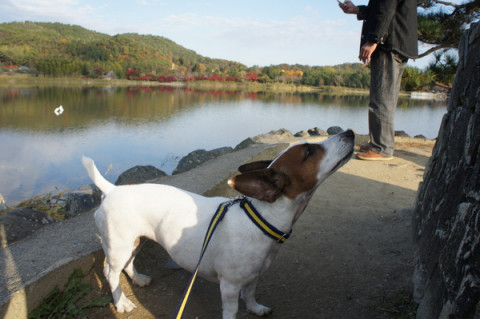 ケイタイで写真撮るおじさん、石碑を読むふりをする犬、そのまるごとを撮るおとうさん。