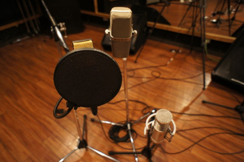 このマイクに、声とギターの音を入れます。