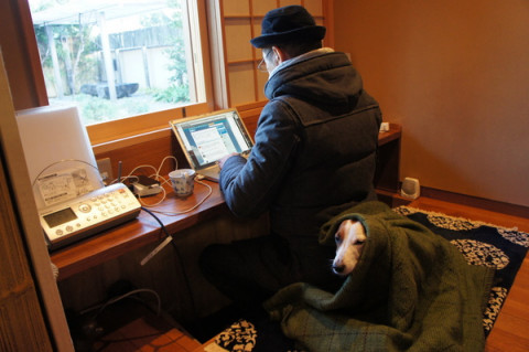 外のかっこうのまま、おとうさんも仕事してます。
