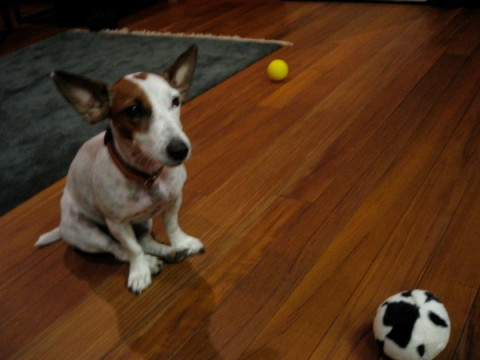 牛のもようのボールが大好きで、いくつもいくつも買ってもらって、噛んでこわしていたんですって。