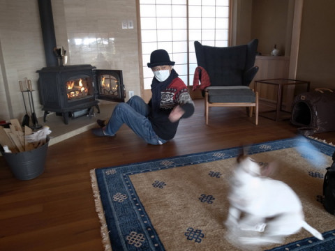 おとうさんは、さっそく、薪運びをして、ストーブ点けます。